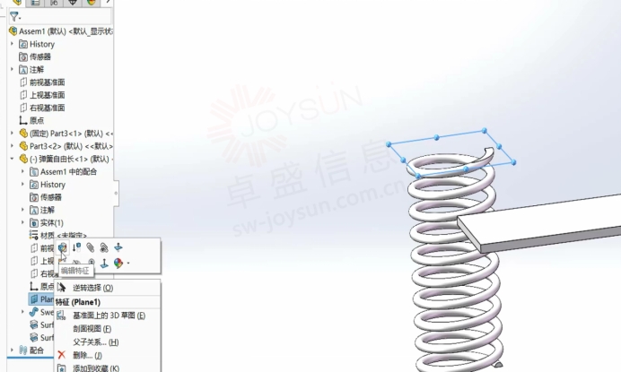 6,保存装配体,之后可删除该装配体中的弹簧,不影响该装配体的使用,伸缩弹簧创建完成,弹簧终止面已有参考,弹簧长度是根据终止面变化的。正版SOLIDWORKS