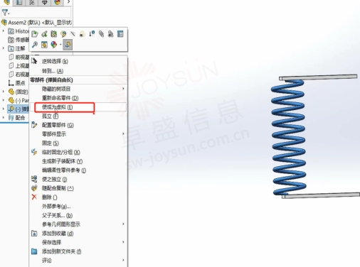 7, 将弹簧插入需要装配的装配体中,右键,选择是零件为柔性(SolidWorks2019版本新增功能)