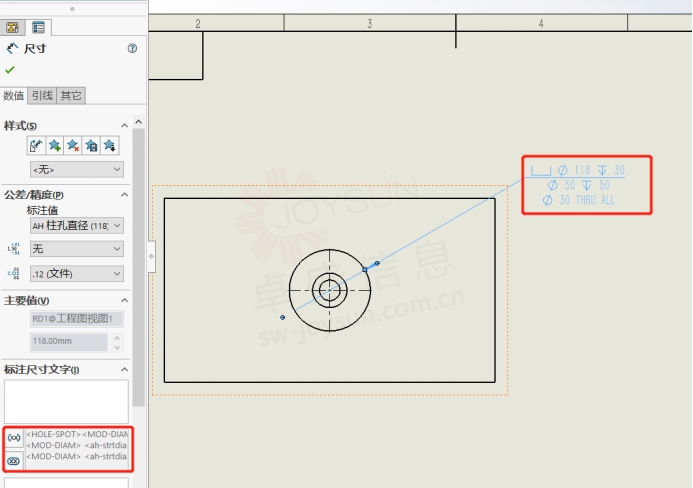到这里我们的图解就演示完毕了,可以看到,虽然拉伸切除可以做出和高级孔一样的效果,但是在后期进行孔标注的时候会发现不能进行编辑,所以我们这里使用孔标注的自定义标注来对我们的属性进行删除或者编辑。